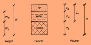 One of the important properties that must be determined in the laboratory analysis is that of the weight-volume relationship of these constituents. The makeup of this soil sample can be illustrated visually as shown in Fig-1, where V represents volume, W represents weight, and the subscripts a, w, and s represent air, water, and solids.