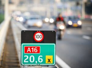 The code in red is a highway number, the code in yellow is the code for roads with lower max speeds, both contain a max speed, if it isn’t very clear from the traffic situation, the box in yellow tells truckers if they could have height clearance issues, Li means links (left) and tells you on which side of the road you are and the lower sign also tells you which government institution is responsible for the road (in this case the province of Utrecht).