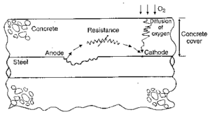 This film is stable in the highly alkaline environment of concrete. However, with time and exposure to Carbon di Oxide in environment which gets dissolved in water and enters the concrete through the permeability and cracks the pH of concrete reduces. As a result, this layer decomposes. And, deleterious agents start attacking the reinforcements resulting in corrosion.
